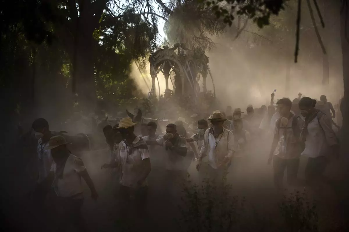 Pilgrims walk through dusty terrain, on their way to the shrine of El Rocio near Aznalcázar, Spain, on Friday, June 6, 2025, during the annual pilgrimage in which hundreds of thousands of devotees of the Virgin del Rocio converge in and around the shrine. (AP Photo/Emilio Morenatti)