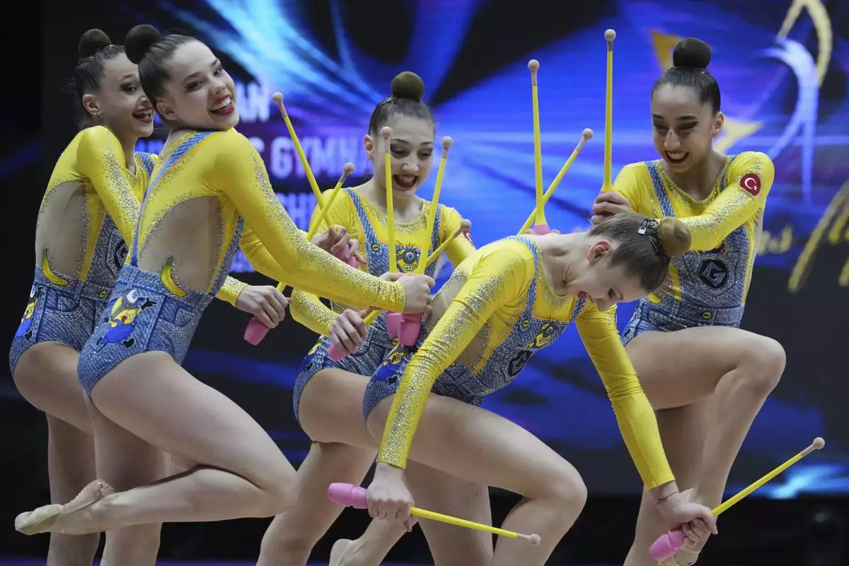 Juniors team of Turkey performs with clubs in the Apparatus final of the European Championships in Rhythmic Gymnastics at the Unibet Arena, Tallinn, Estonia, Wednesday, June 4, 2025. (AP Photo/Sergei Grits)