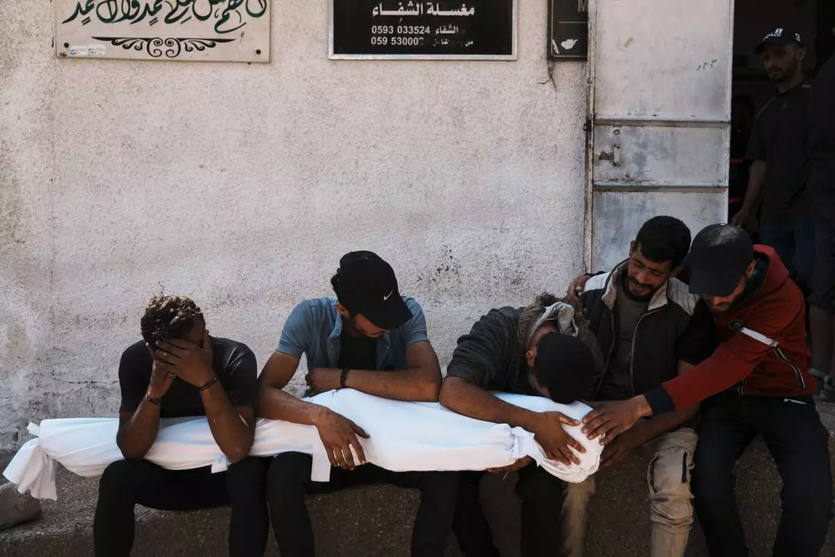 Palestinians mourn over the bodies of their relatives who were killed in an Israeli military strike on Gaza. at Al-Shifa Hospital in Gaza City, Wednesday, June 4, 2025. (AP Photo/Jehad Alshrafi)