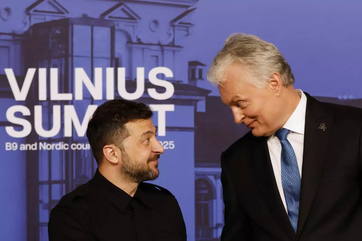Lithuania's President Gitanas Nauseda, right, welcomes Ukraine's President Volodymyr Zelenskyy during arrivals for the Vilnius Summit at the Palace of the Grand Dukes of Lithuania in Vilnius, Lithuania, Monday, June 2, 2025. (AP Photo/Mindaugas Kulbis)