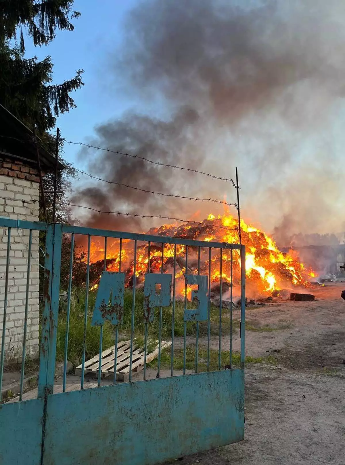 In this photo released by Acting Governor of the Kursk Region Alexander Khinshtein telegram channel on Saturday, May 31, 2025, a view of a fire at the territory of an agrofirm after Ukrainian drones struck near Rylsk in the western Kursk region of Russia. (Acting Governor of the Kursk Region Alexander Khinshtein via AP)