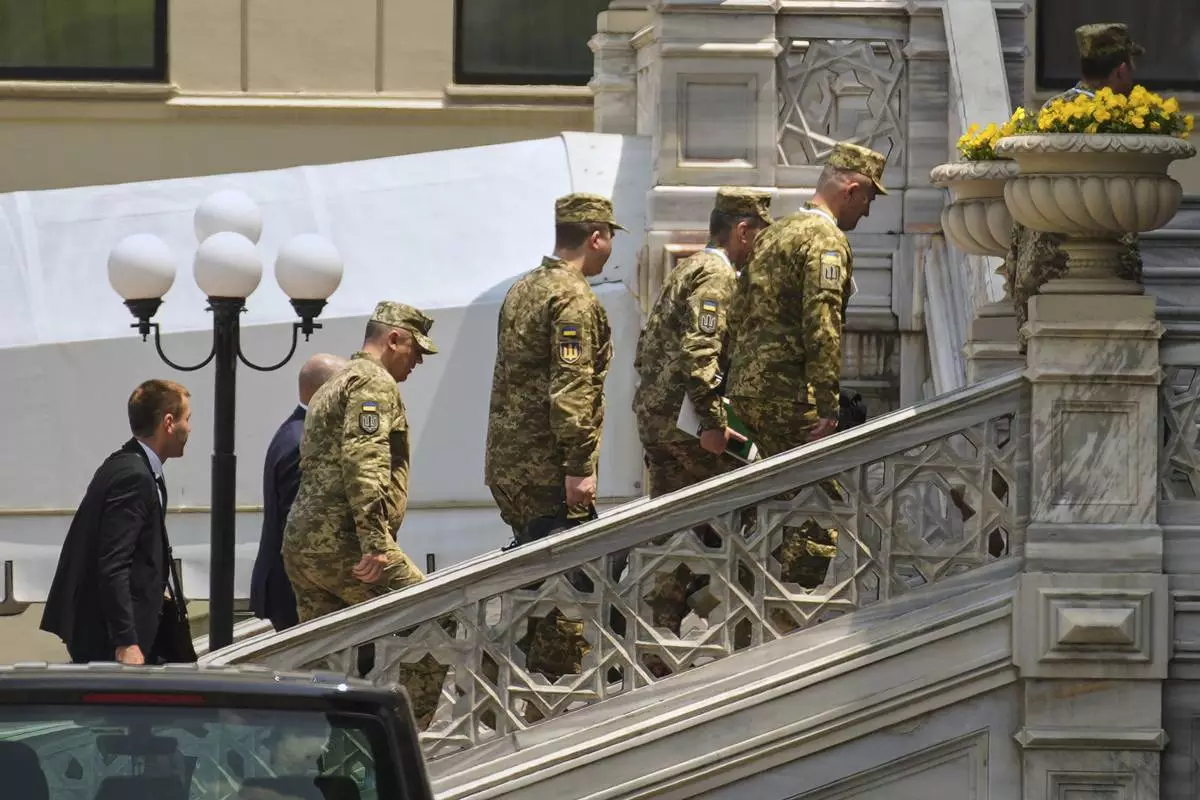 Members of the Ukrainian delegation arrive at the Ciragan Palace for Russia-Ukraine peace talks in Istanbul, Turkey, Monday, June 2, 2025. (AP Photo/Emrah Gurel)