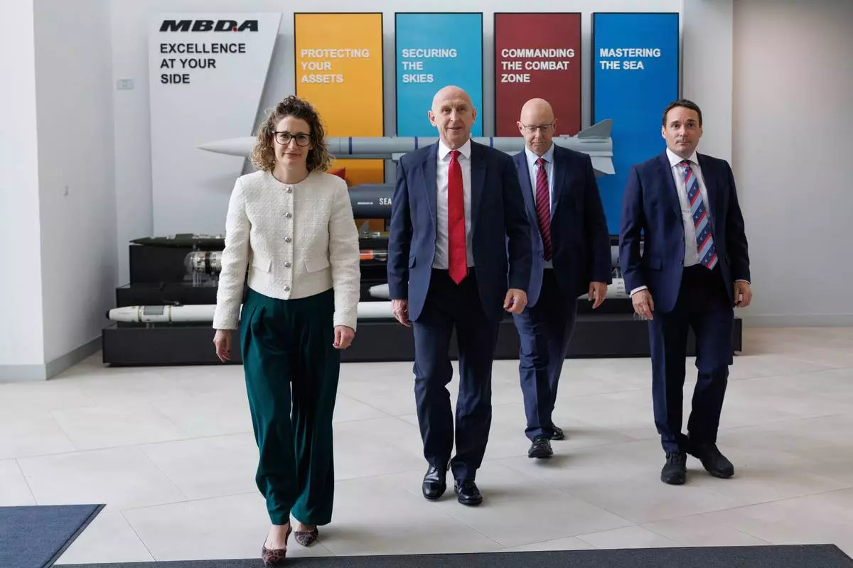 Britain's Defence Secretary John Healey, second left, visits the MBDA Storm Shadow factory in Stevenage, England, Saturday May 31, 2025. (Dan Kitwood/Pool via AP)