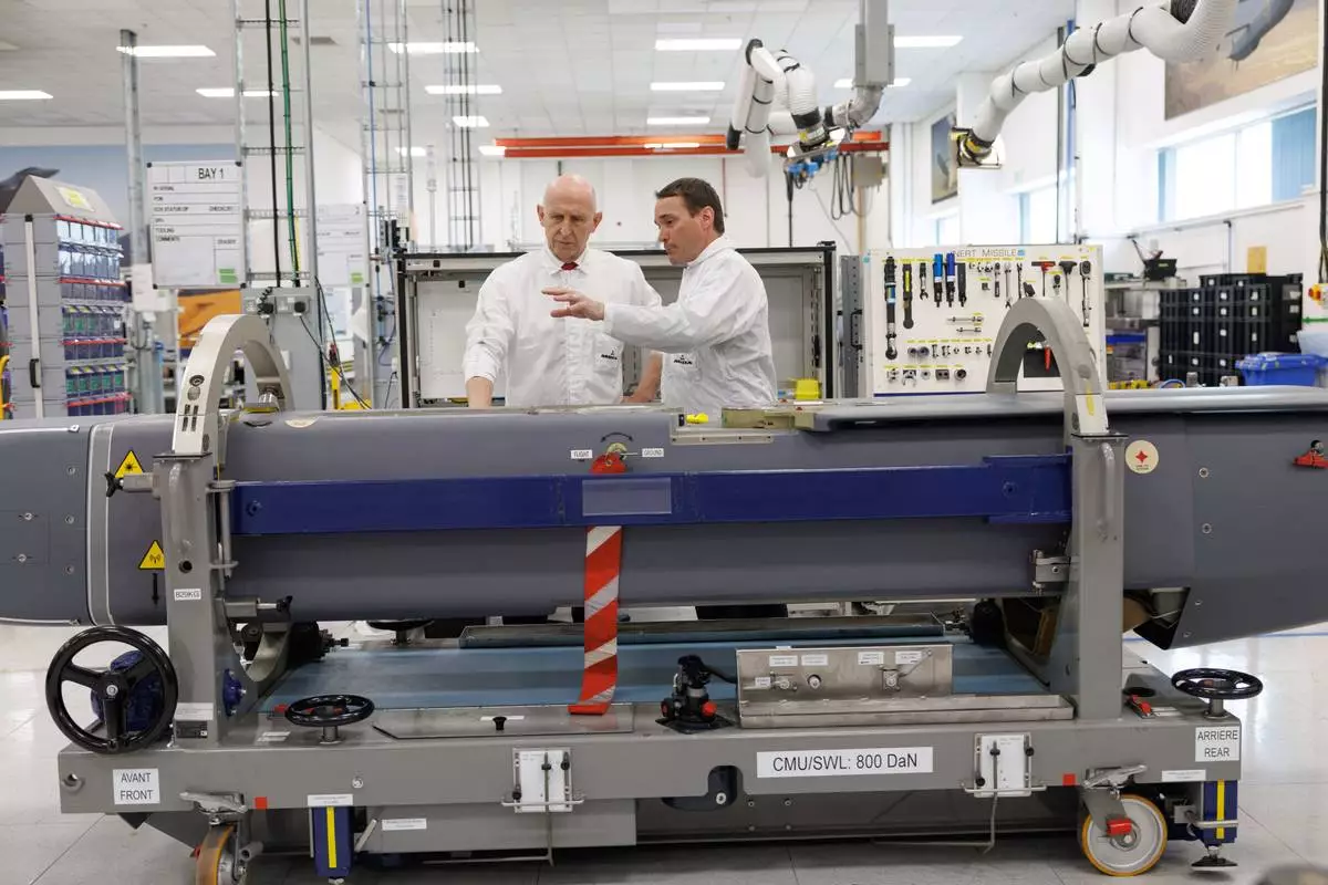 Director of Mechanical Engineering Matt Beamont, right, shows Britain's Defence Secretary John Healey a storm shadow missile on an assembly line at the MBDA Storm Shadow factory in Stevenage, England, Saturday May 31, 2025. (Dan Kitwood/Pool via AP)