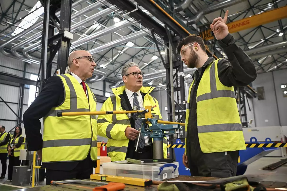 Britain's Prime Minister Keir Starmer, center, and Britain's Defence Secretary John Healey, left, speak to a member of staff during a visit to the BAE Systems'Govan facility, in Glasgow, Scotland, Monday June 2, 2025. (Andy Buchanan, Pool Photo via AP)