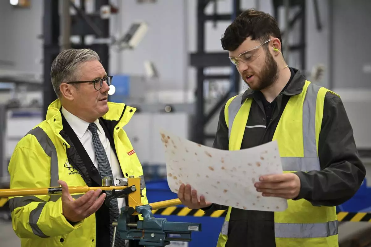Britain's Prime Minister Keir Starmer, left, speaks to a member of staff during a visit to the BAE Systems'Govan facility, in Glasgow, Scotland, Monday June 2, 2025. (Andy Buchanan, Pool Photo via AP)