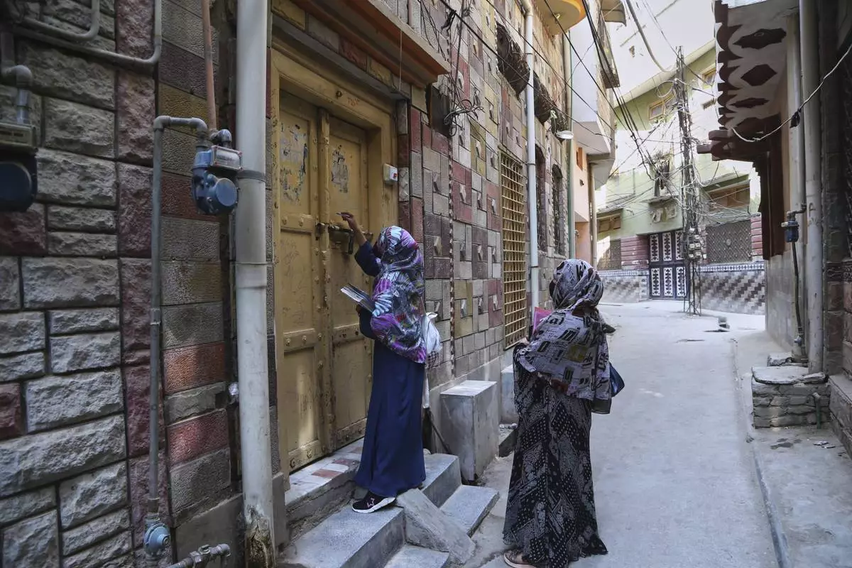 A health worker, left, administers a polio vaccine to a child at a neighborhood in Peshawar, Pakistan, Monday, May 26, 2025. (AP Photo/Muhammad Sajjad)
