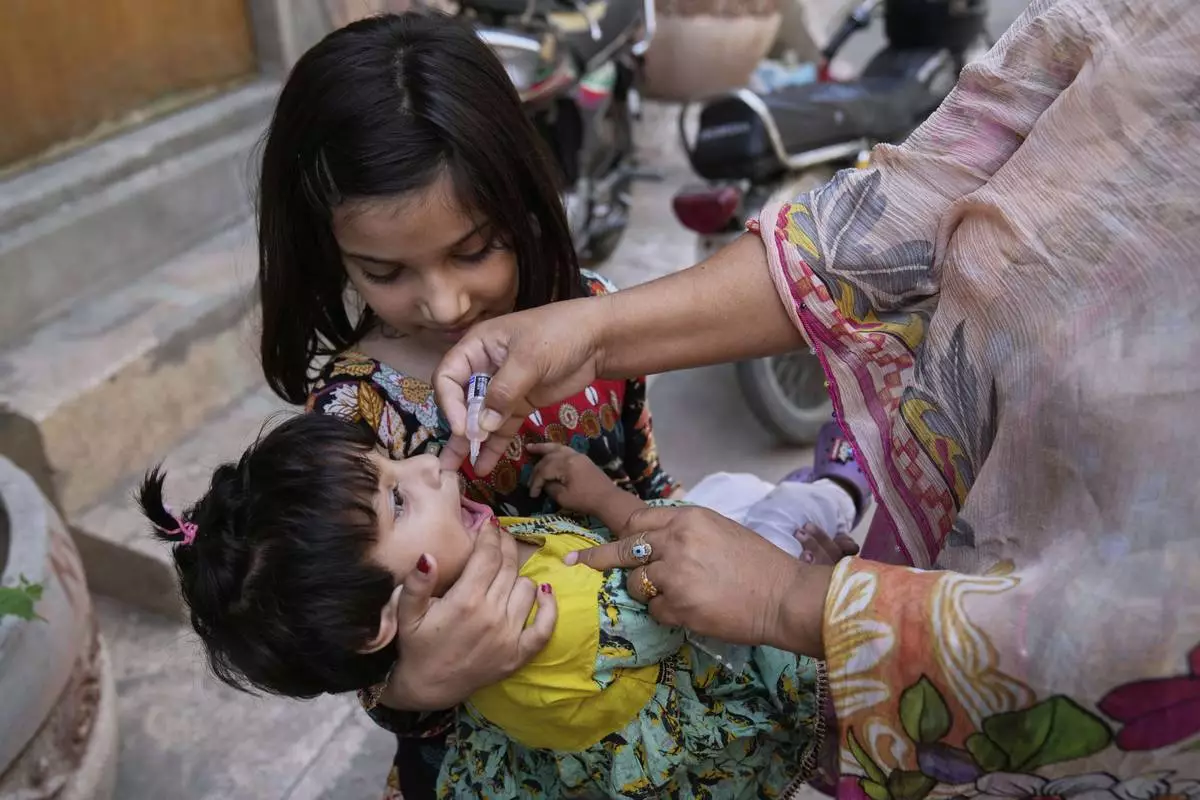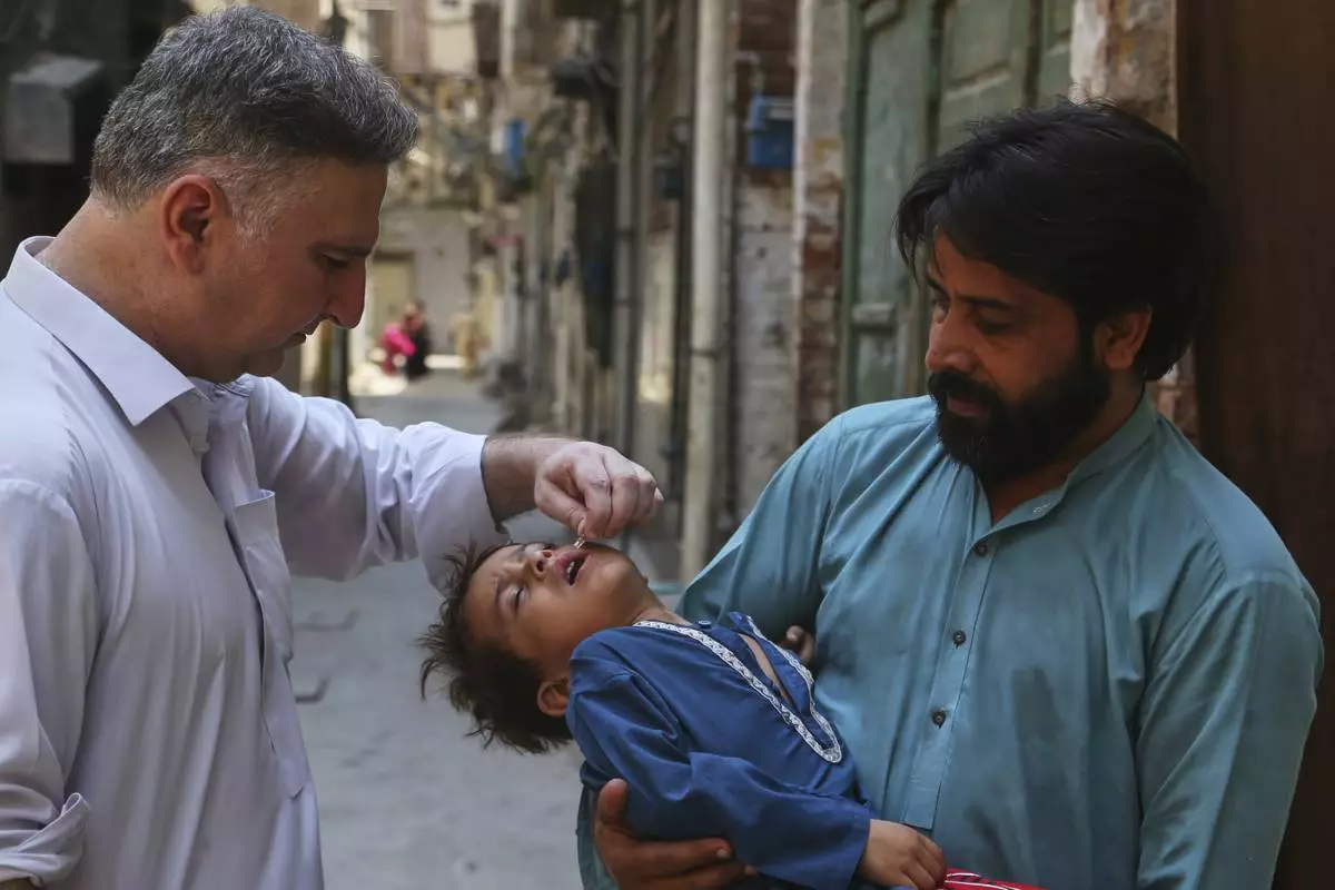 A health worker administers a polio vaccine to a child at a neighbourhood, in Lahore, Pakistan, Monday, May 26, 2025. (AP Photo/K.M. Chaudary)