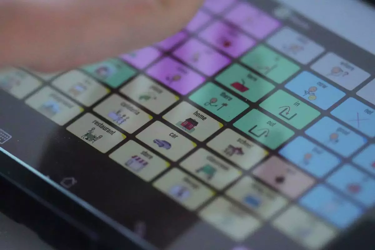 Charlie Lamb, who is diagnosed with autism and is non-verbal, uses an AAC device to communicate with a caregiver, Monday, May 12, 2025, in Austin, Texas. (AP Photo/Eric Gay)