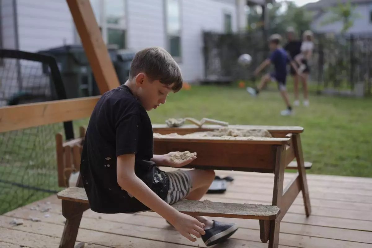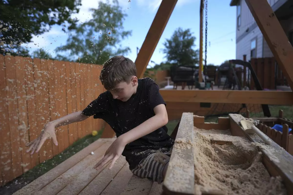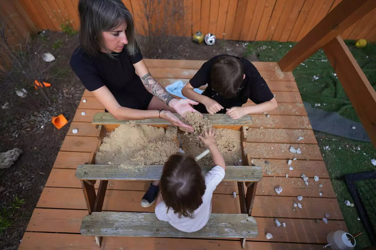 Charlie Lamb, from left, who is diagnosed with autism, plays with sand at his home, while his brother Jude and mother Eileen Lamb, who also have autism, and sister Billie, play soccer, Monday, May 12, 2025, in Austin, Texas. (AP Photo/Eric Gay)