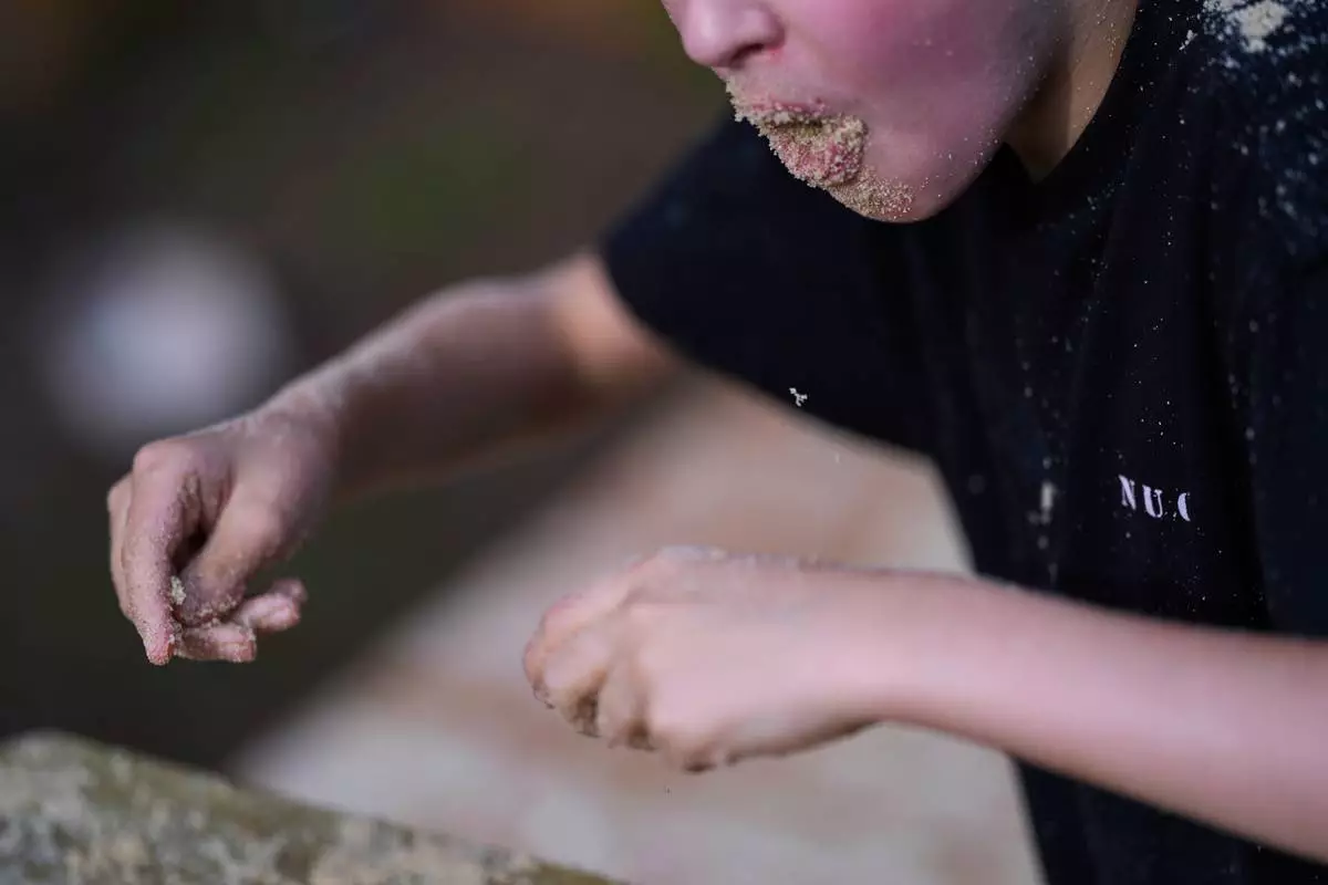 Charlie Lamb, who is diagnosed with autism, plays with sand at his home, Monday, May 12, 2025, in Austin, Texas. (AP Photo/Eric Gay)
