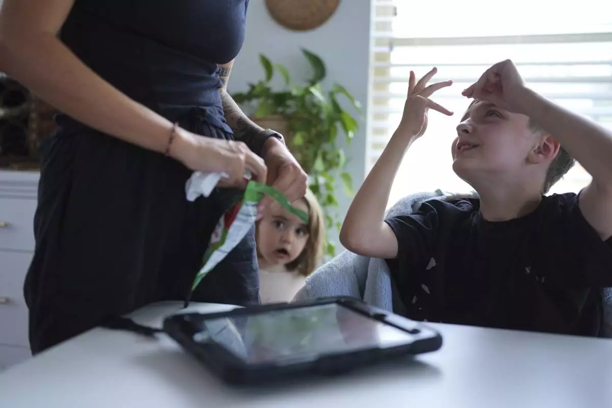 Charlie Lamb, center, who is diagnosed with autism and is non-verbal, uses an AAC device to communicate with a caregiver, Monday, May 12, 2025, in Austin, Texas. (AP Photo/Eric Gay)