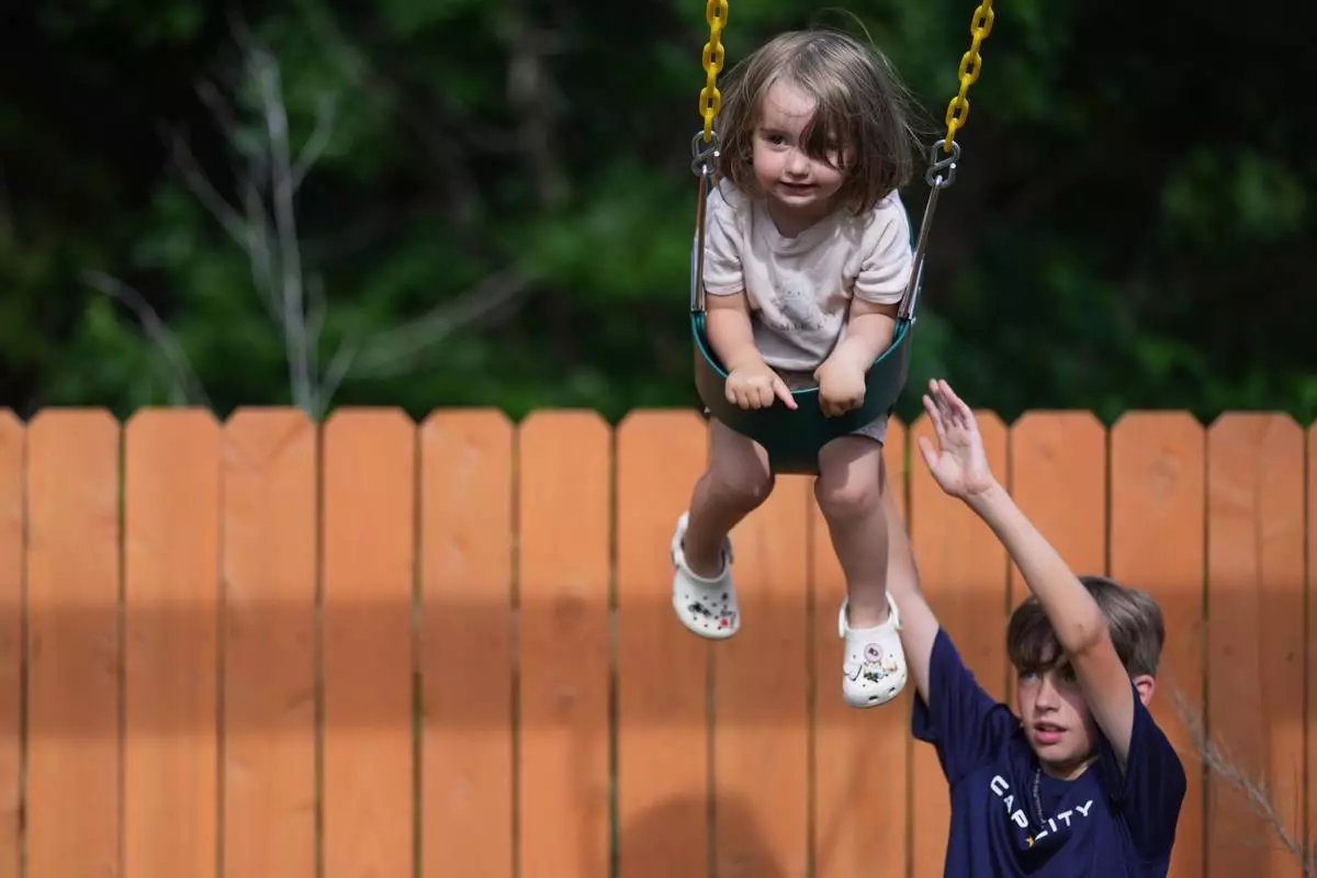 Jude, who is diagnosed with autism, plays with his sister Billie in their backyard, Monday, May 12, 2025, in Austin, Texas. (AP Photo/Eric Gay)