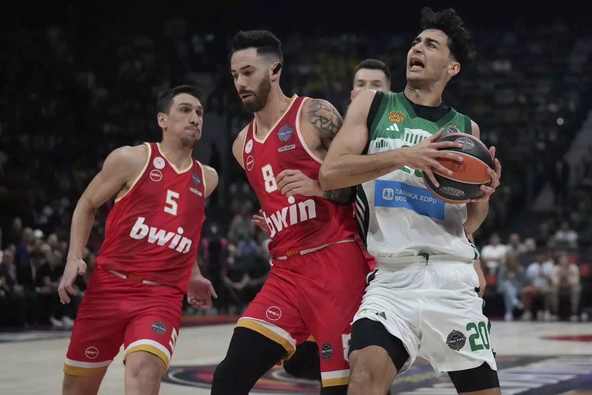 FILE - Panathinaikos's Alexandros Samodurov, right, tries to go past Olympiacos' Luca Vildoza during a Euroleague basketball match for the third place in Abu Dhabi, United Arab Emirates, May 25, 2025. (AP Photo/Altaf Qadri, file)