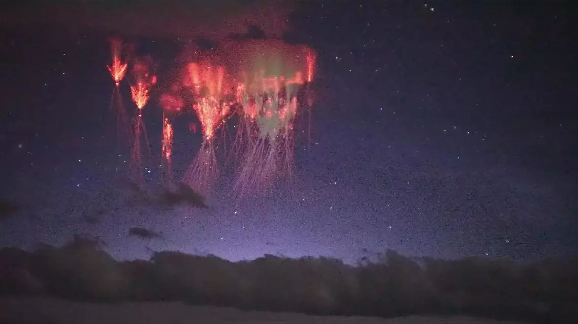 In the camera footage, the lightning bolts, emitting an orange red glow, illuminate the starry sky just like a fireworks explosion, creating an enchanting spectacle. Some appeared in the shape of jellyfish.