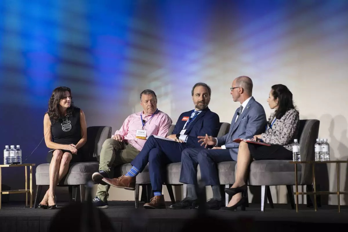 Lauren Harrison, left, moderating a discussion about litigation funding with Judge Alan Albright, Judge Michael Engelhart, Judge Charles Eskridge, and former Judge Nancy Atlas.
