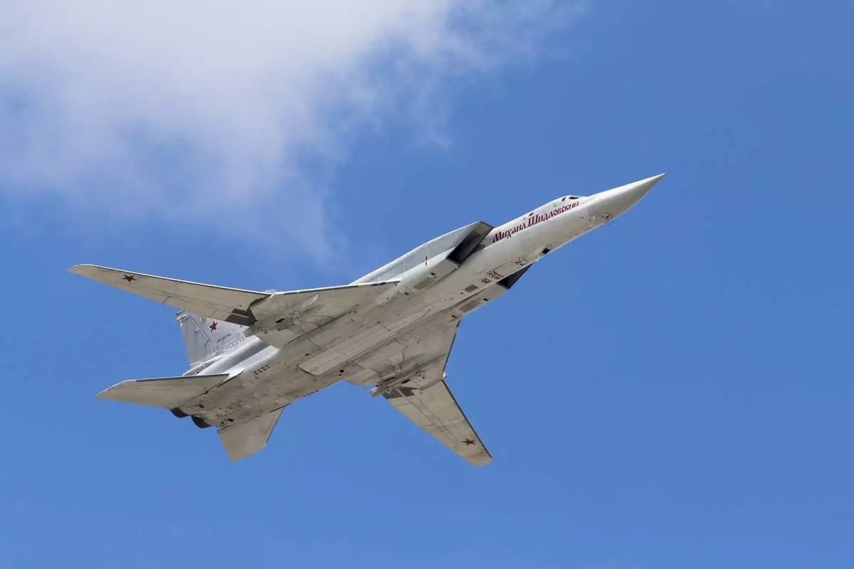 FILE - A TU-22M bomber plane flies over Red Square during a rehearsal for the Victory Day military parade in Moscow, Russia, May 7, 2016. (AP Photo/Alexander Zemlianichenko, File)