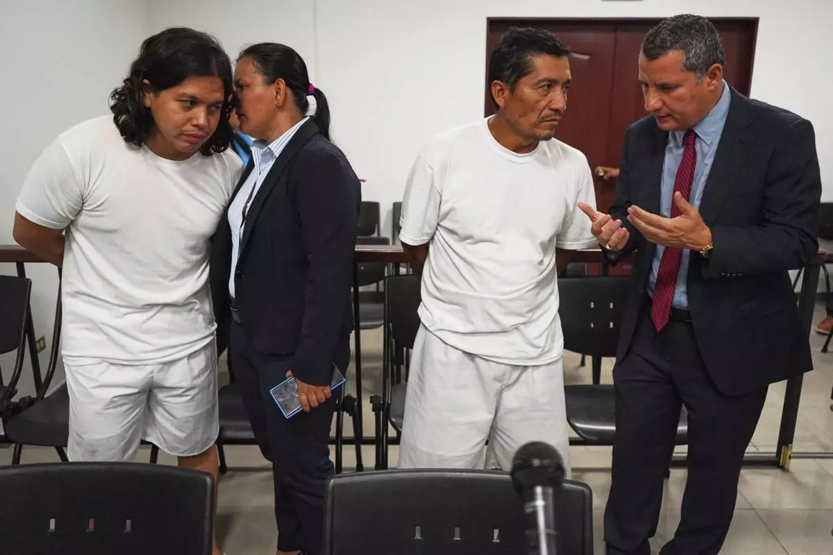 Alejandro Henriquez, left, and Jose Angel Perez, second from right, speak with their lawyers prior to their first court hearing in Santa Tecla, El Salvador, Friday, May 30, 2025. The National Civil Police arrested them for protesting near the presidential residence. (AP Photo/Salvador Melendez)