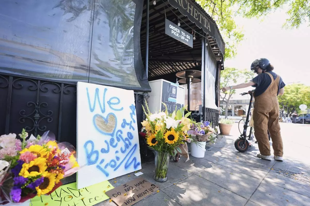 A man looks at signs left in front the restaurant Buona Forchetta, the site of a recent ICE operation in the neighborhood of South Park, Monday, June 2, 2025, in San Diego. (AP Photo/Gregory Bull)