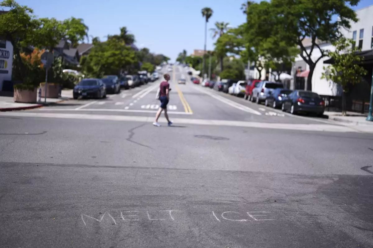 A man crosses a street where graffiti reads "melt ICE," at the site of a recent ICE operation at a popular Italian restaurant in the neighborhood of South Park Monday, June 2, 2025, in San Diego. (AP Photo/Gregory Bull)