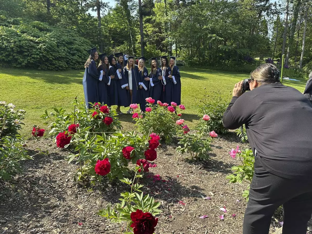 Soon-to-be high school graduates pose for photos among the peonies at Nichols Arboretum's W.E. Upjohn Peony Garden, Monday, June 2, 2025, in Ann Arbor, Mich. (AP Photo/Mike Householder)