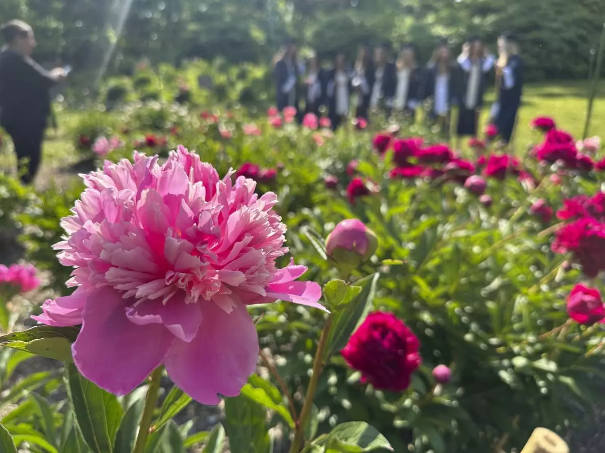 A peony is on display with soon-to-be high school graduates posing for photos in the distance at Nichols Arboretum's W.E. Upjohn Peony Garden, Monday, June 2, 2025, in Ann Arbor, Mich. (AP Photo/Mike Householder)