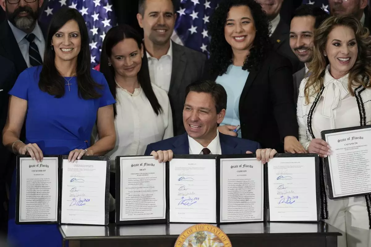 FILE - Florida Governor Ron DeSantis, seated, and other elected, state, and local officials pose with a group of education-related bills after DeSantis signed them into law at a press conference in Miami, Tuesday, May 9, 2023. (AP Photo/Rebecca Blackwell, File)
