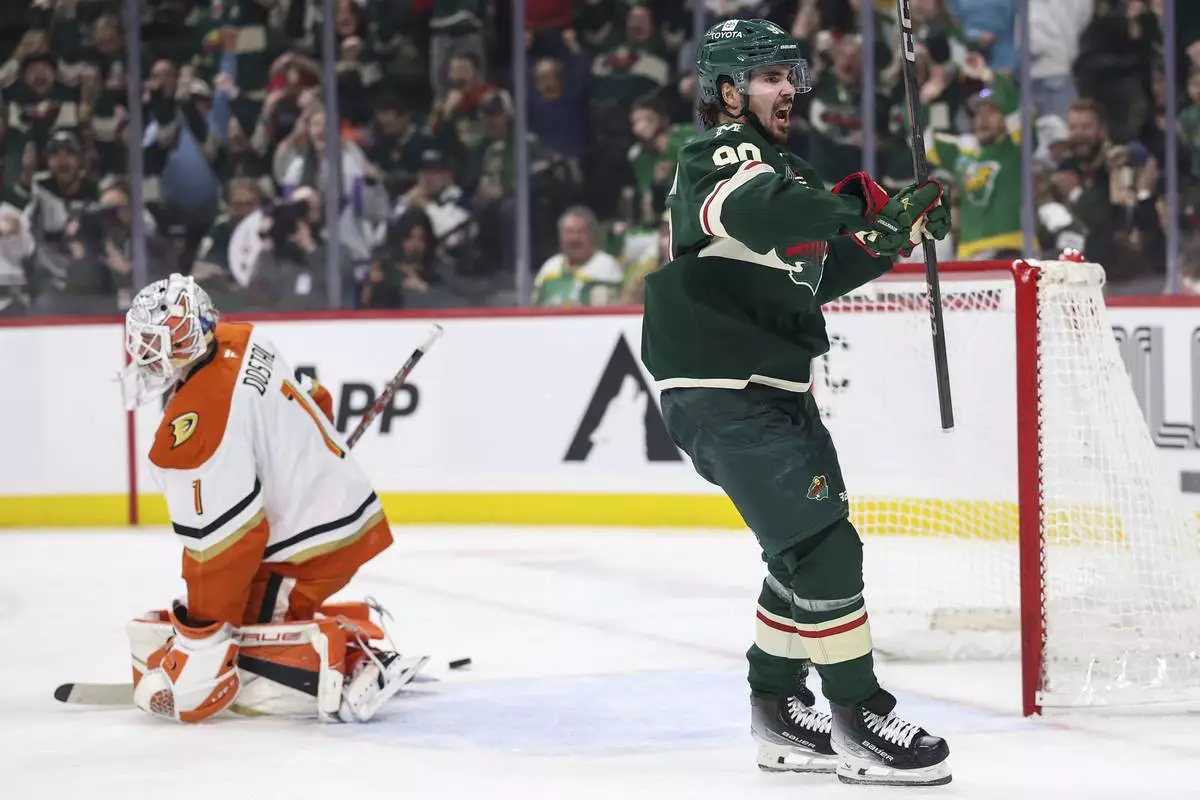 FILE - Minnesota Wild left wing Marcus Johansson, right, celebrates his goal against Anaheim Ducks goaltender Lukas Dostal during the first period of an NHL hockey game Tuesday, April 15, 2025, in St. Paul, Minn. (AP Photo/Matt Krohn, File)