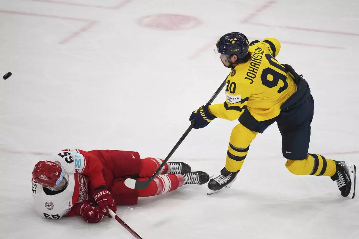 Sweden's Marcus Johansson shoots over Denmark's Christian Wejse during the bronze medal match between Denmark and Sweden at the ice hockey world championships in Stockholm, Sweden, Sunday, May 25, 2025. (AP Photo/Petr David Josek)