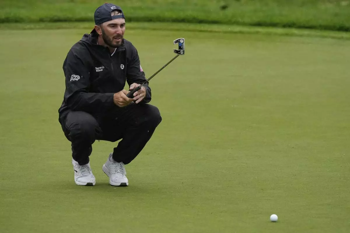 Max Homa lines up his putt on the 13th green during the second round of the Memorial golf tournament, Friday, May 30, 2025, in Dublin, Ohio. (AP Photo/Sue Ogrocki)