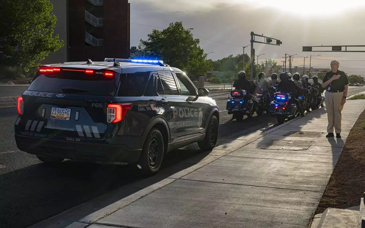 Albuquerque police officers head down Lomas Boulevard in Albuquerque New Mexico as they helped escort Bloomfield police officer Timothy Ontiveros' body on.Sunday, June 1, 2025. (Jessica Baca/The Albuquerque Journal via AP)