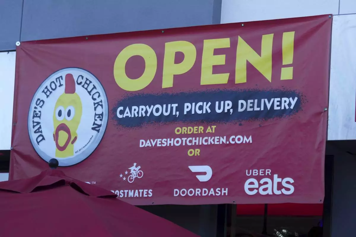 An open sign for Dave's Hot Chicken restaurant is seen in the Little Tokyo district of Los Angeles Monday, June 2, 2025. (AP Photo/Damian Dovarganes)