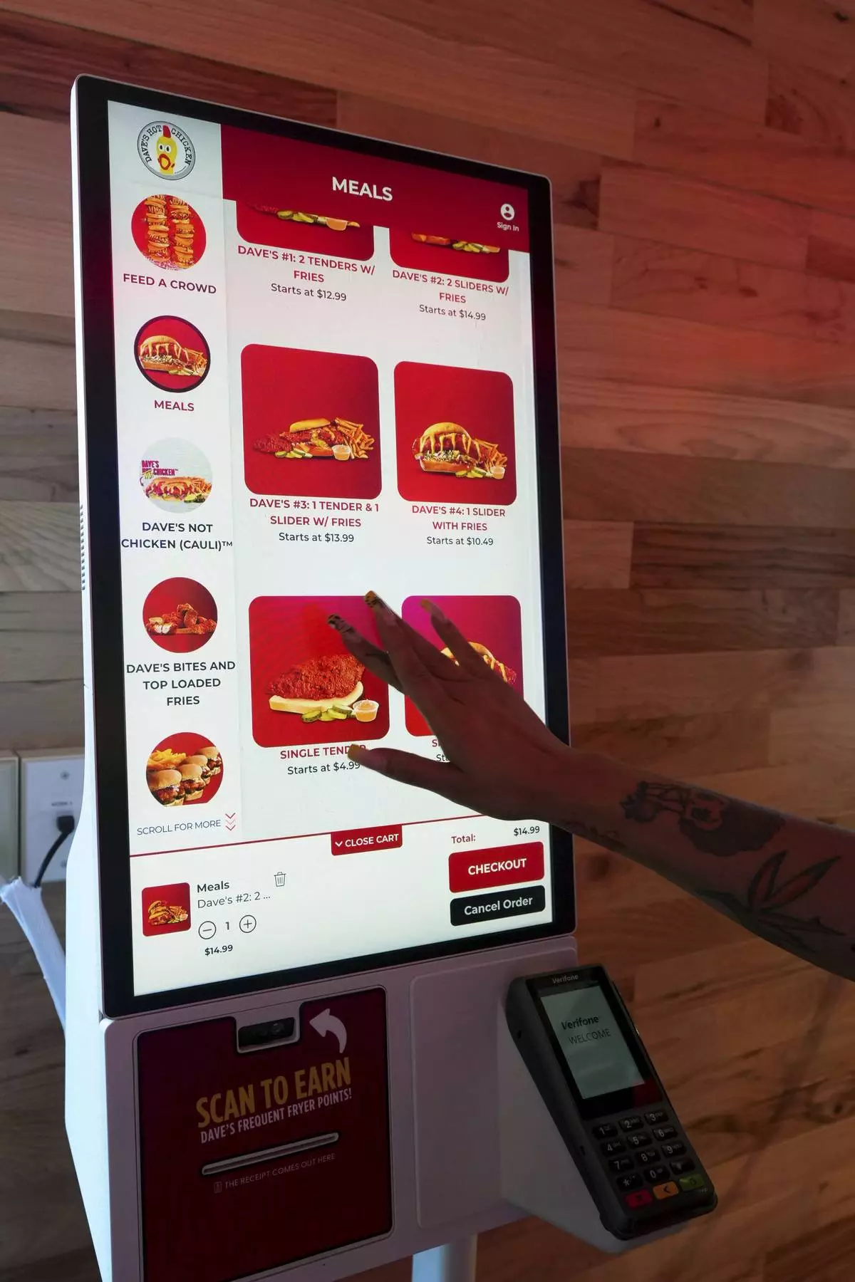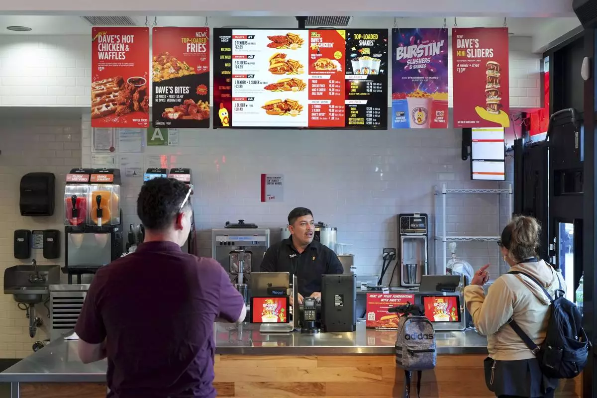 A customer uses a touch screen to order inside Dave's Hot Chicken restaurant in the Little Tokyo district of Los Angeles Monday, June 2, 2025. (AP Photo/Damian Dovarganes)