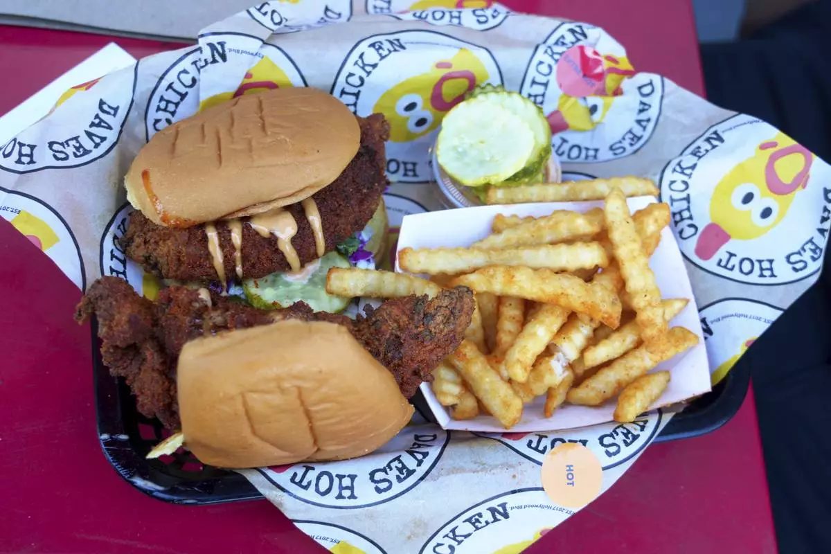 Dave's Hot Chicken food is seen at the restaurant in the Little Tokyo district of Los Angeles Monday, June 2, 2025. (AP Photo/Damian Dovarganes)