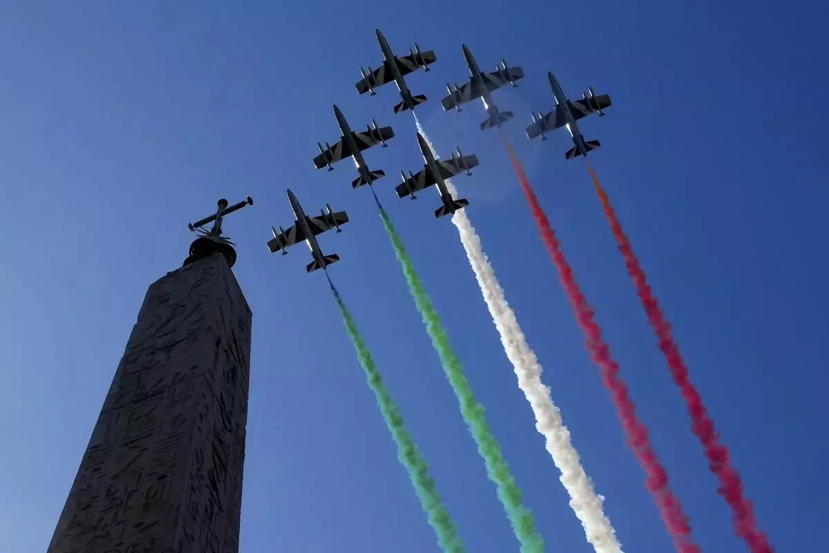 The Frecce Tricolori (Tricolor Arrows) aerobatic squad of the Italian Air Force flies during the celebrations for the 79th Republic Day in Rome, Monday, June 2, 2025. (AP Photo/Gregorio Borgia)