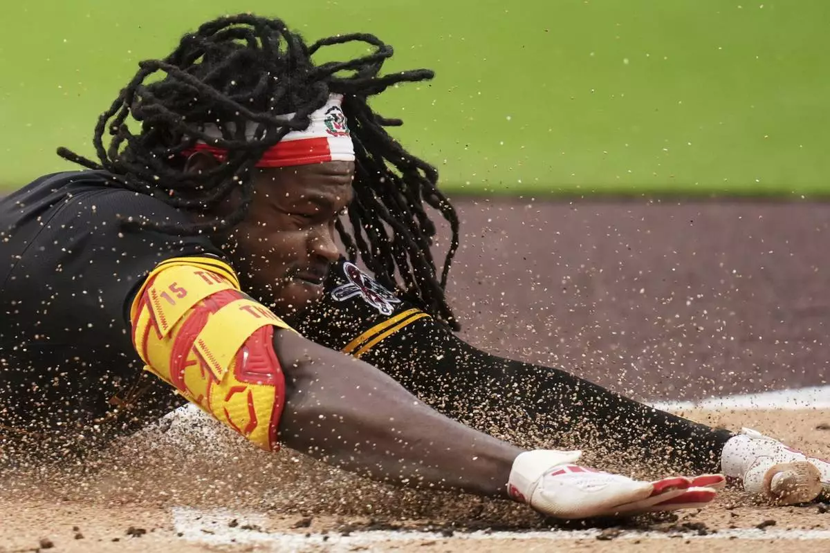 Pittsburgh Pirates' Oneil Cruz slides into home, scoring from second base off an RBI single by Bryan Reynolds during the first inning of a baseball game against the San Diego Padres Saturday, May 31, 2025, in San Diego. (AP Photo/Gregory Bull)