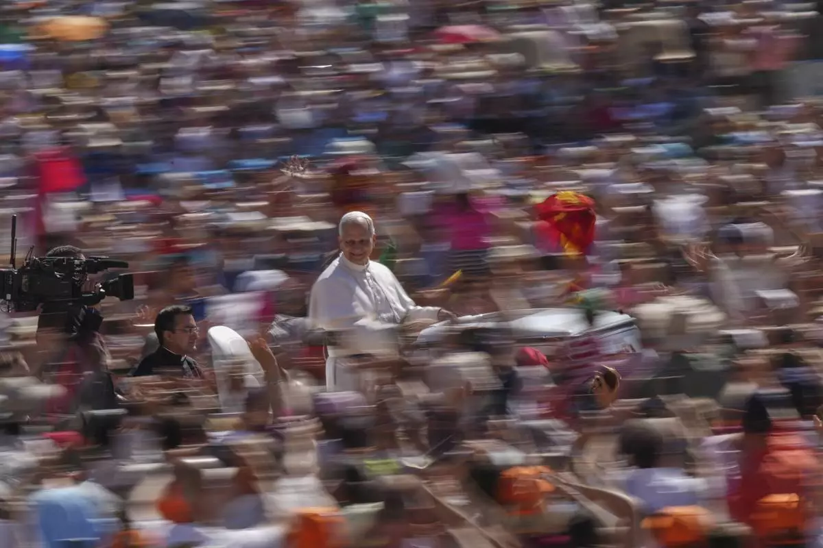 Pope Leo XIV arrives on his pope mobile before celebrating a Mass for the Jubilee of Families in St. Peter's Square, at the Vatican, Sunday, June 1, 2025. (AP Photo/Andrew Medichini)