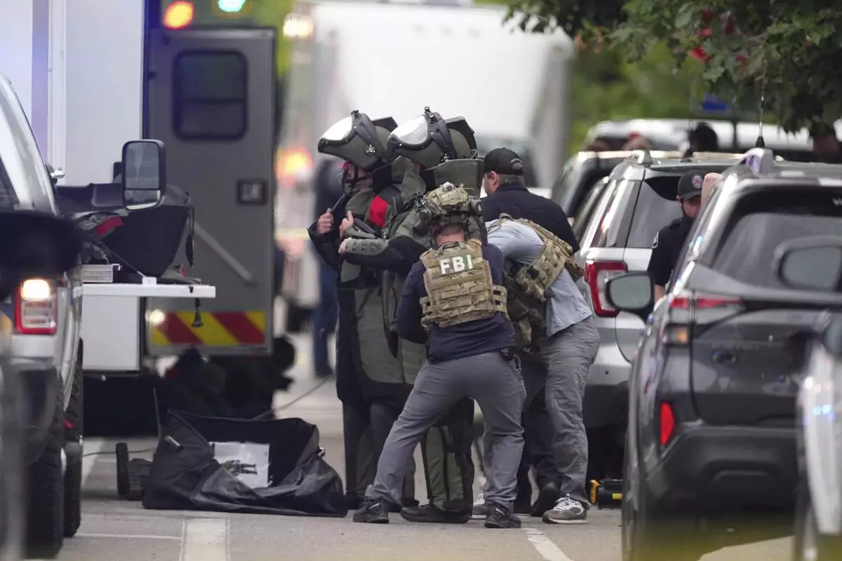Law enforcement officials dress in protective gear to investigate after an attack on the Pearl Street Mall Sunday, June 1, 2025, in Boulder, Colo. (AP Photo/David Zalubowski)
