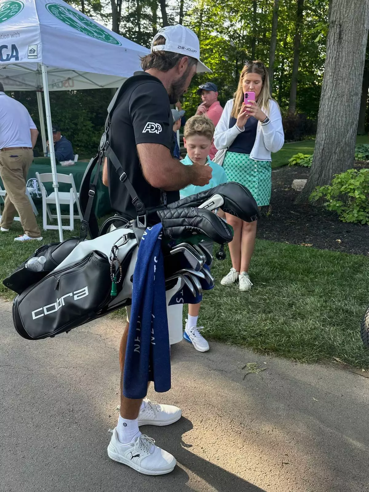 Max Homa stops to sign an autograph after his U.S. Open qualifier carrying his own bag after a split with his caddie, on Monday, June 2, 2025, in Columbus, Ohio. (AP Photo/Doug Ferguson)