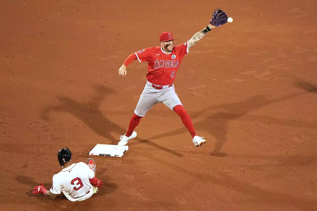 Los Angeles Angels shortstop Zach Neto makes the out at second on Boston Red Sox's Ceddanne Rafaela during the sixth inning of a baseball game, Monday, June 2, 2025, in Boston. (AP Photo/Robert F. Bukaty)