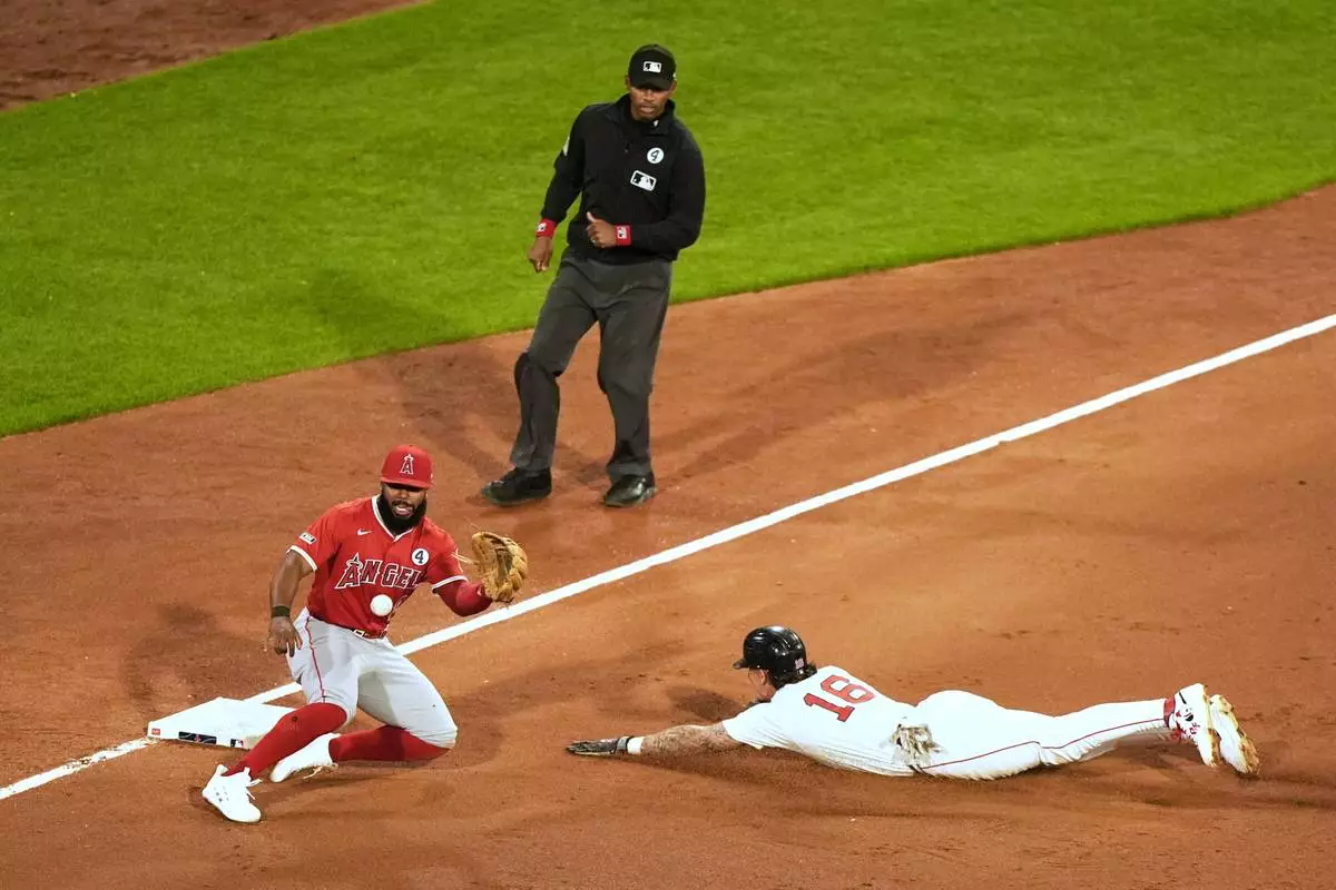 Boston Red Sox left fielder Jarren Duran beats a throw to Los Angeles Angels' Luis Rengifo on a steal after a wild pitch in the fifth inning of a baseball game Monday, June 2, 2025, in Boston. (AP Photo/Robert F. Bukaty)