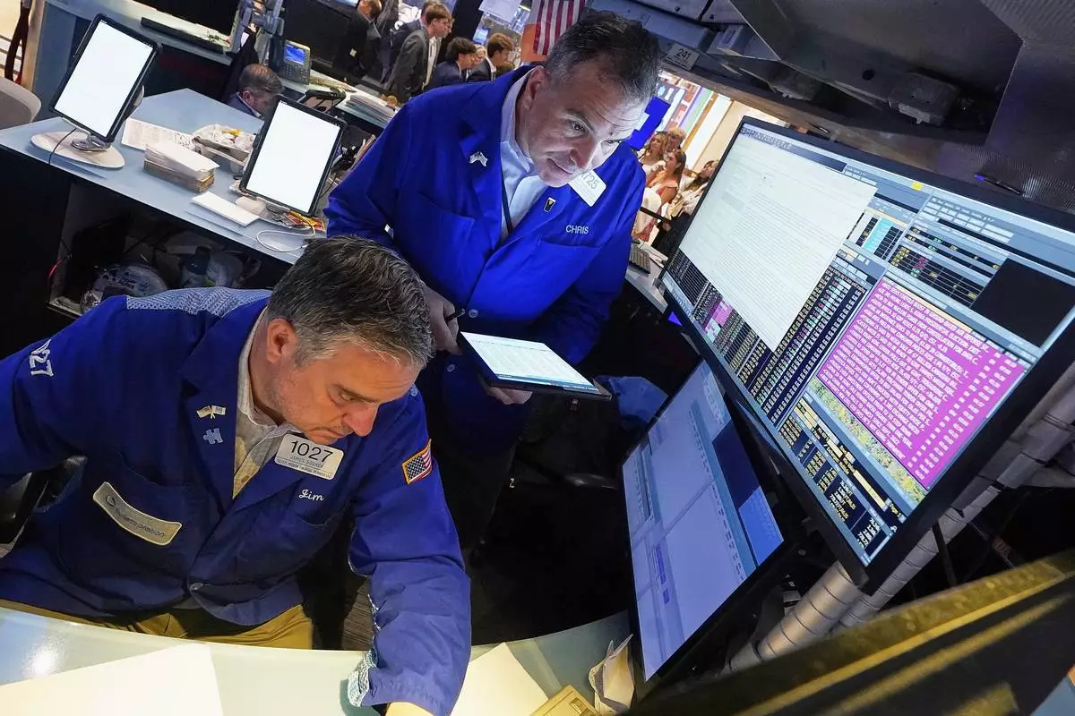 Specialist Michael Pistillo, left, and trader Robert Charmak work on the floor of the New York Stock Exchange, Tuesday, June 3, 2025. (AP Photo/Richard Drew)