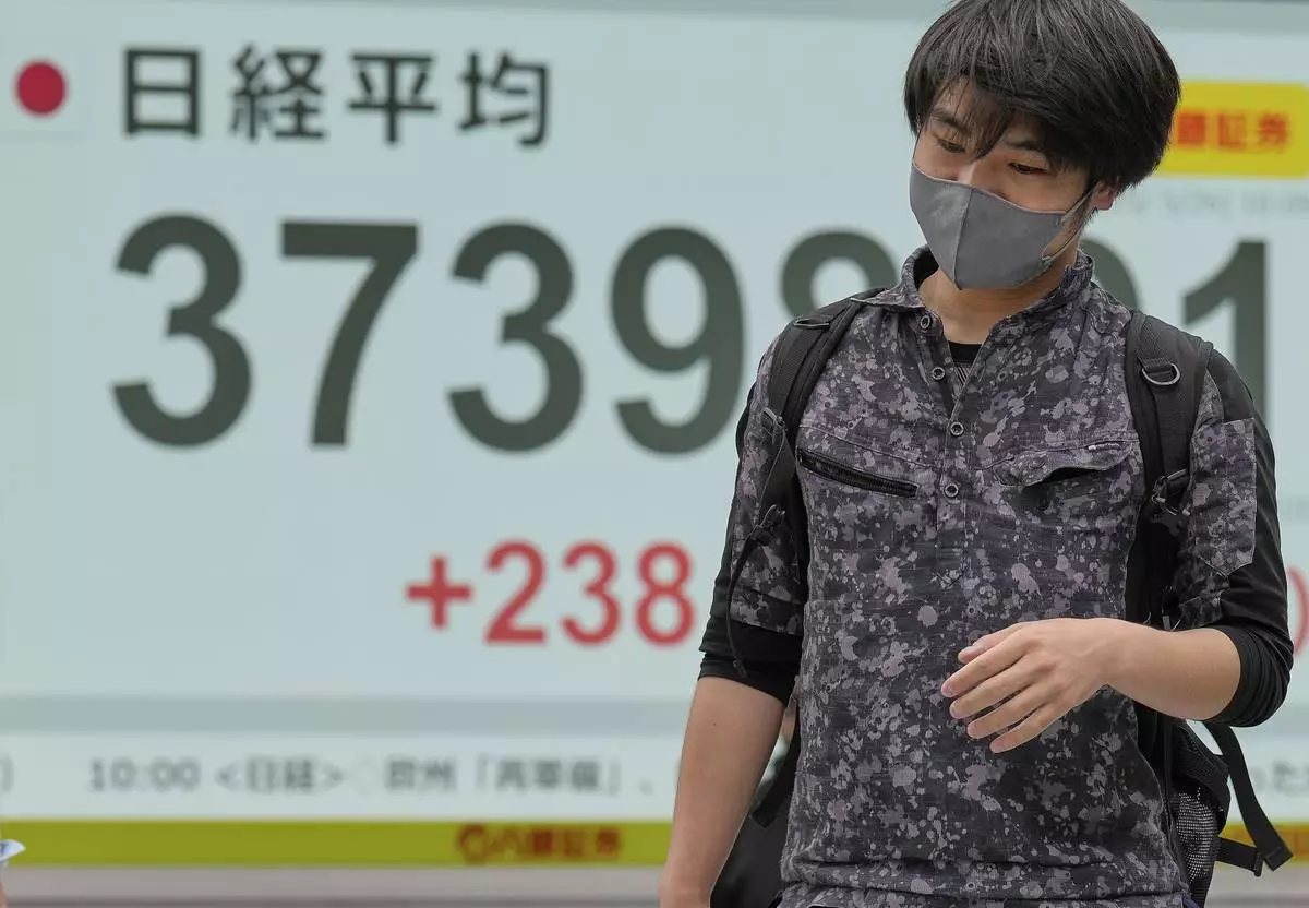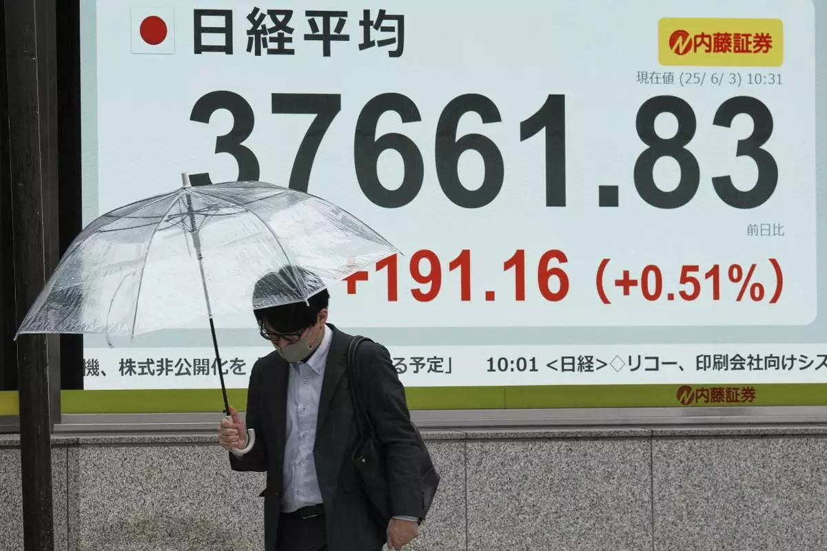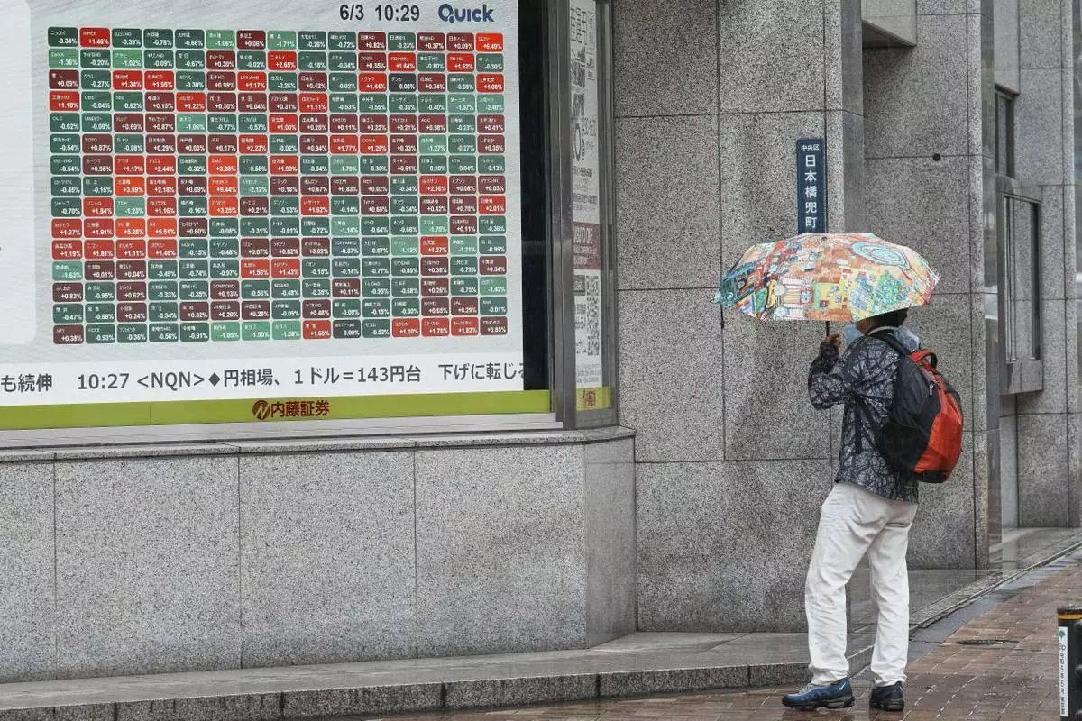 A person walks in front of an electronic stock board showing Japan's Nikkei index at a securities firm Tuesday, June 3, 2025, in Tokyo. (AP Photo/Eugene Hoshiko)