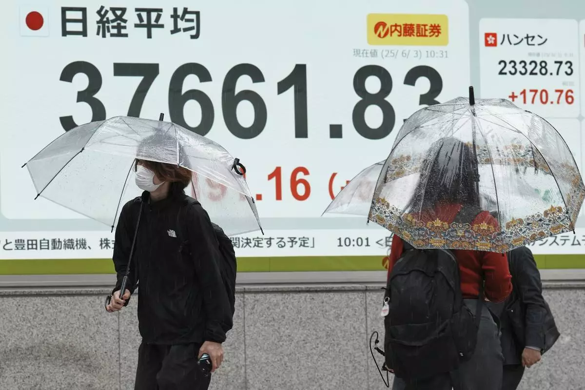 People walk in the rain in front of an electronic stock board showing Japan's Nikkei index at a securities firm Tuesday, June 3, 2025, in Tokyo. (AP Photo/Eugene Hoshiko)