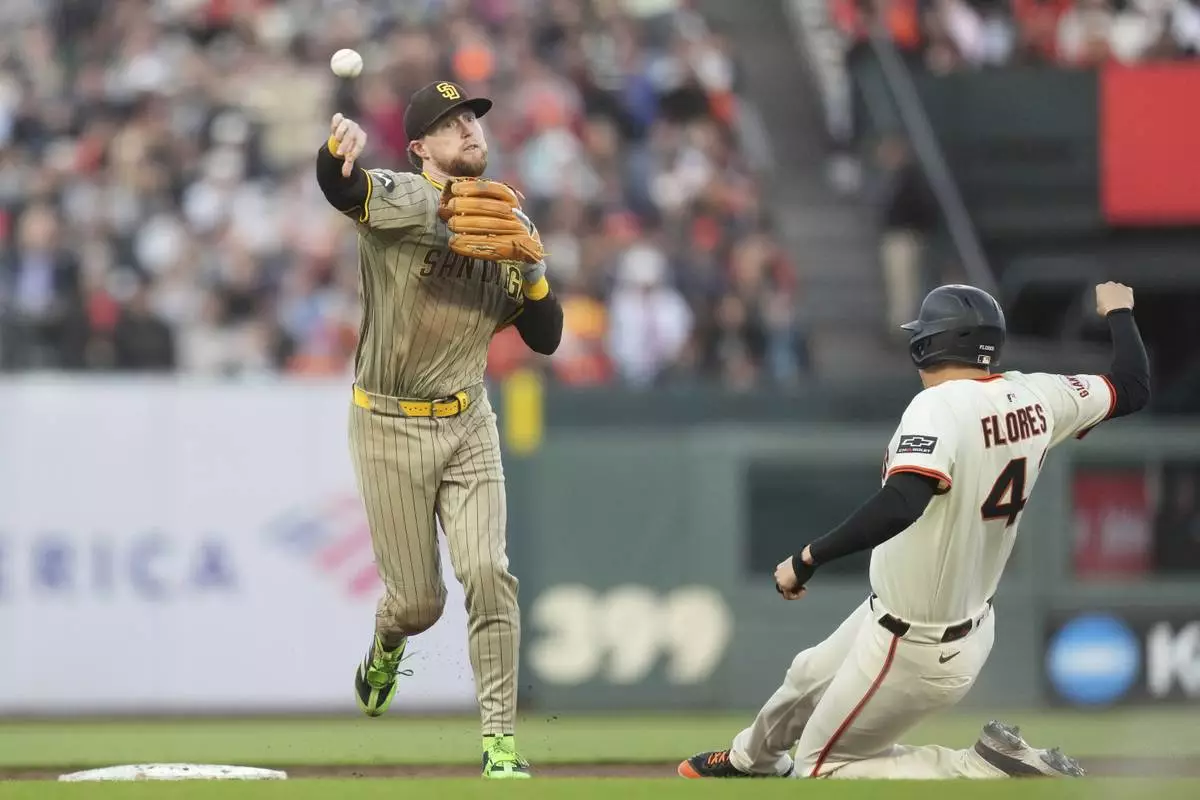 San Diego Padres second baseman Jake Cronenworth, left, throws to first base after forcing San Francisco Giants' Wilmer Flores, right, out at second base on a double play hit into by Matt Chapman during the third inning of a baseball game in San Francisco, Monday, June 2, 2025. (AP Photo/Jeff Chiu)