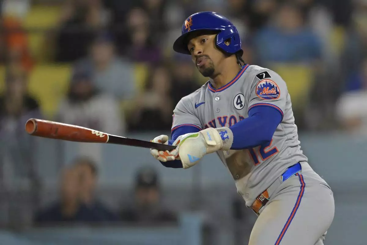 New York Mets' Francisco Lindor singles in a run in the tenth inning of a baseball game against the Los Angeles Dodgers, Monday, June 2, 2025, in Los Angeles. (AP Photo/Jayne Kamin-Oncea)