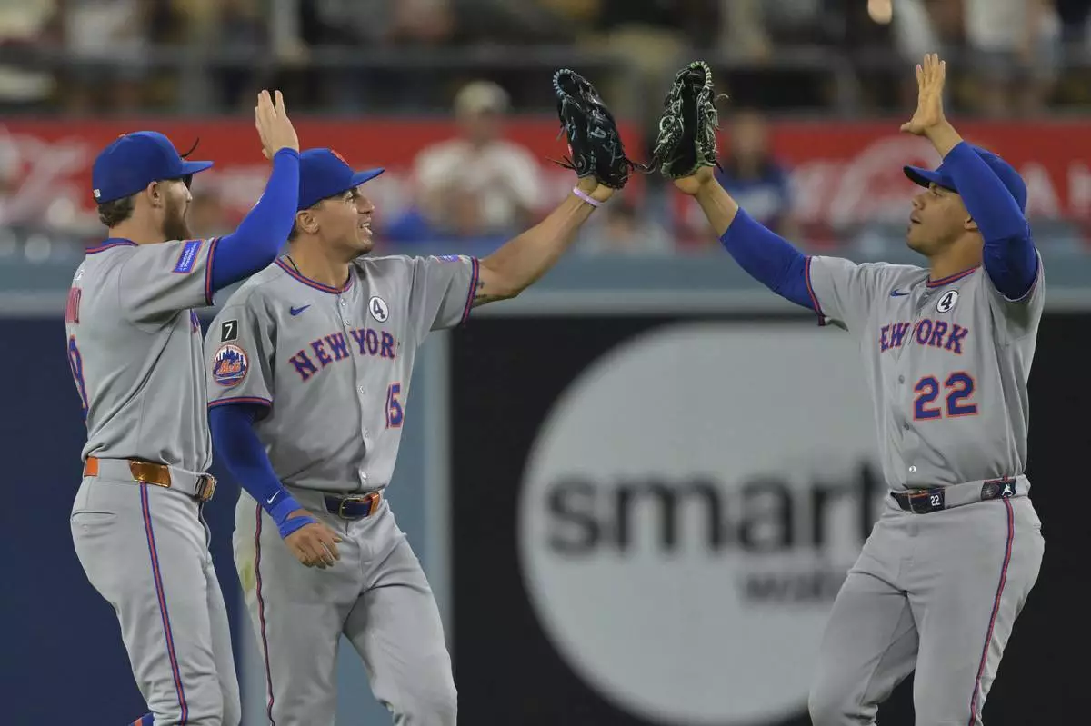 New York Mets left fielder Brandon Nimmo, left, Mets center fielder Tyrone Taylor and Mets right fielder Juan Soto (22) high five after the final out in the tenth inning of a baseball game against the Los Angeles Dodgers, Monday, June 2, 2025, in Los Angeles. (AP Photo/Jayne Kamin-Oncea)