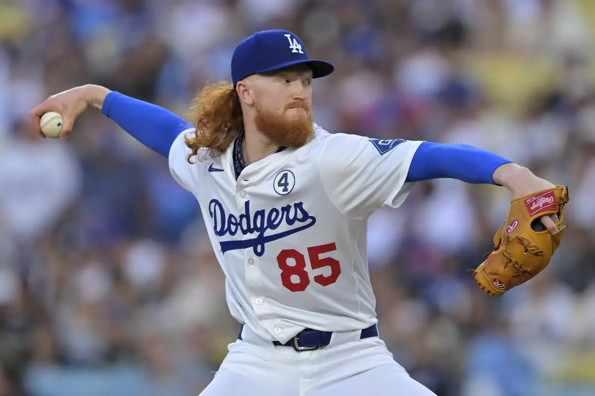 Los Angeles Dodgers starting pitcher Dustin May delivers to the plate during the first inning of a baseball game against the New York Mets, Monday, June 2, 2025, in Los Angeles. (AP Photo/Jayne Kamin-Oncea)