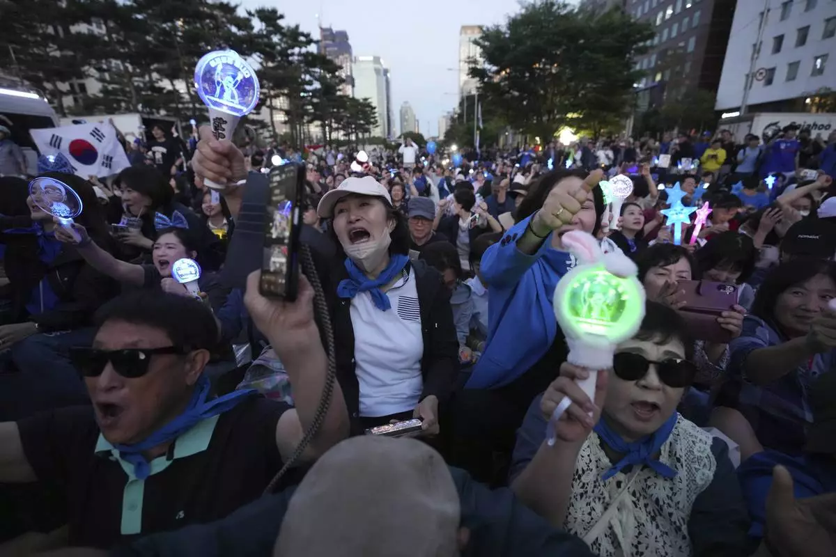 Supporters of South Korea's Democratic Party's presidential candidate Lee Jae-myung, react outside the National Assembly in Seoul, South Korea, Tuesday, June 3, 2025. (AP Photo/Lee Jin-man)