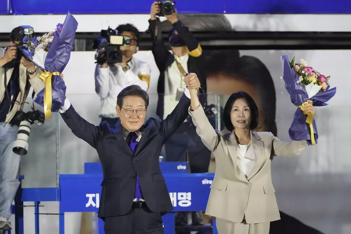 South Korea's Democratic Party's presidential candidate Lee Jae-myung, and his wife Kim Hea Kyung, celebrate outside of the National Assembly in Seoul, South Korea, Wednesday, June 4, 2025. (AP Photo/Lee Jin-man)